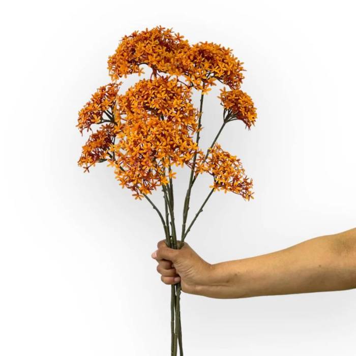 Crafted with meticulous attention to detail, our Crown Spray Orange Artificial Flowers look just like the real thing—minus the wilting! Each stem is made from premium silk, sourced from top local suppliers, so you can trust that your flowers will stay bright and beautiful for years to come. With a variety of styles and colours available, you’ll find the perfect arrangement to match your vibe, whether it’s for a dinner party, wedding, or just a regular Tuesday.